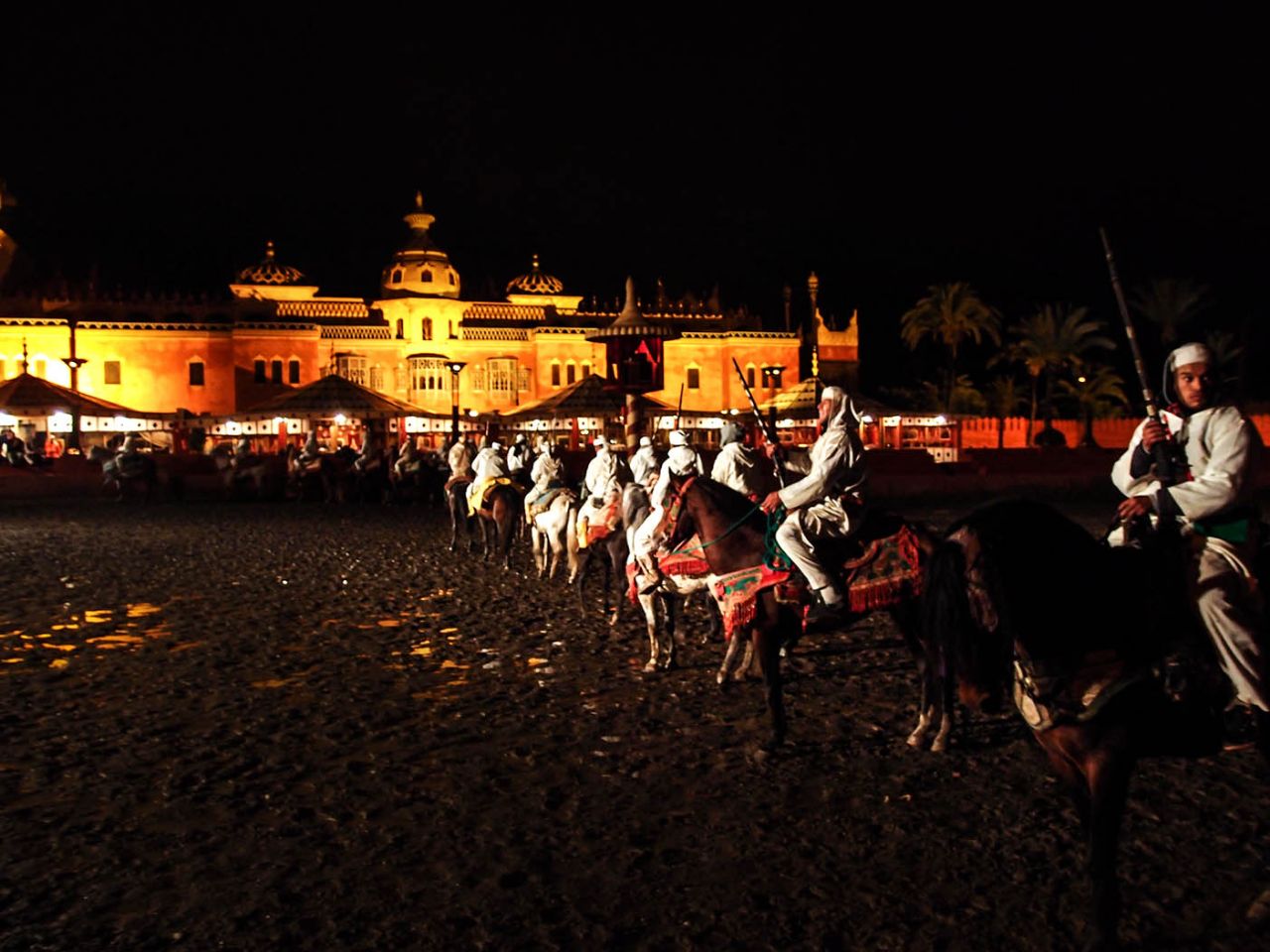 At the end of this magical evening, you will witness a re-enactment of the scenes of the war as the horse-train battles between the ancient Berbers and the Knights of the Desert unfold. Amidst the deafening noise of explosions and smoke, all the soldiers in their traditional uniforms clashed in the square. Then, giant fireworks will light up the sky to end this wonderful evening.
